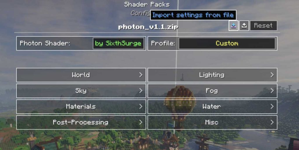 I would highly suggest using my settings for Photon 1.1 – it depths just a little bit more realism with a tough of DoF. You can download them by clicking here. Then you just open the modded minecraft (With all the mods installed), and then go to your pause menu –> Options –> Video Settings –> Shader Packs –> Shader Pack Settings –> and then click the import button towards the top. Select the downloaded file, and click apply button at the bottom of the shader pack settings: