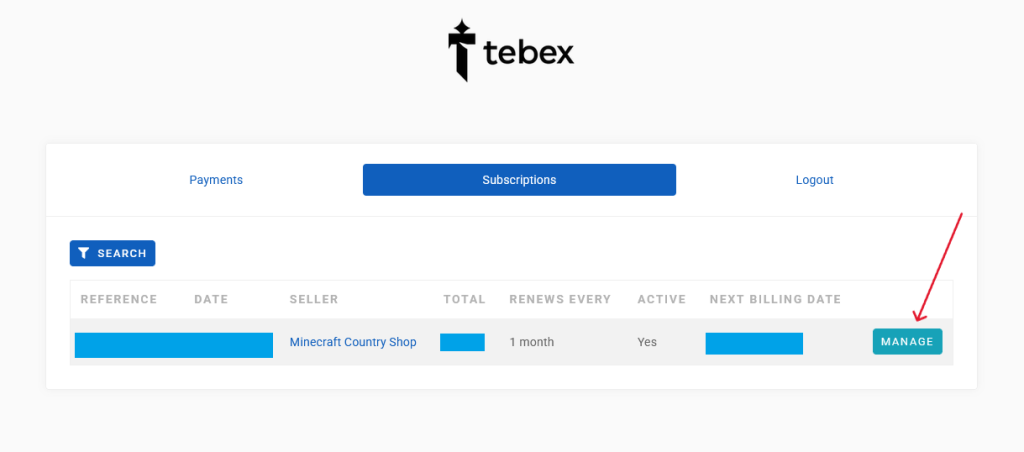Once on the subscriptions page, look for any current subscription to the minecraft country shop, and then click the Manage button.