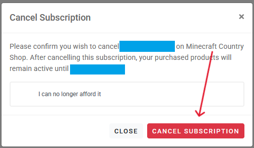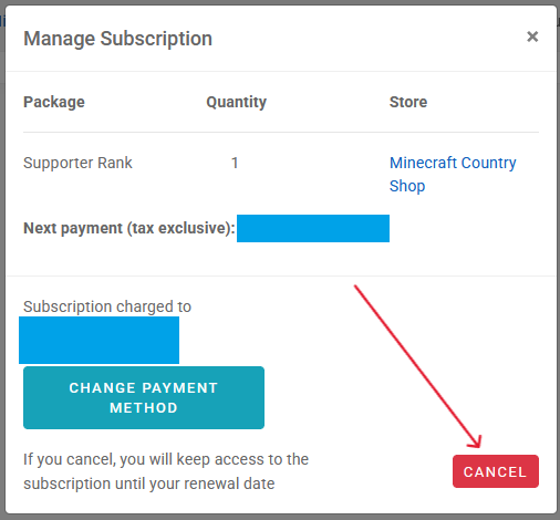 After clicking the manage button, a pop-up window will appear. On this window there are some of your subscription details, the option to change your payment method, and a cancel button. Click the cancel button and confirm that you wish to end your subscription (You will still have your rank until the next renewal period, when it will cancel the subscription).